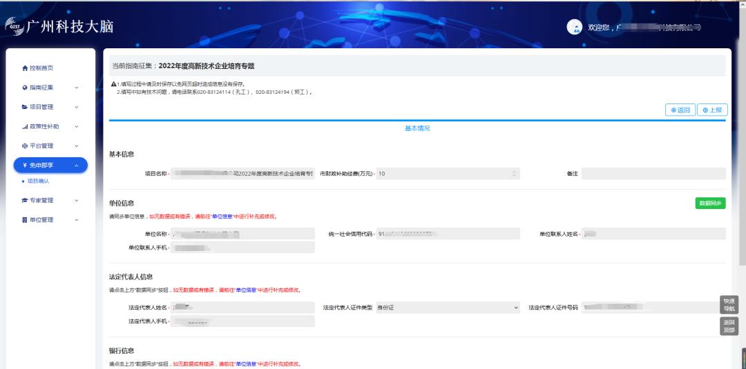 5.登录后,系统自动跳转至高新技术企业培育专题补助,查看经办人信息、申请主体信息,需填写联系地址、法定代表人。